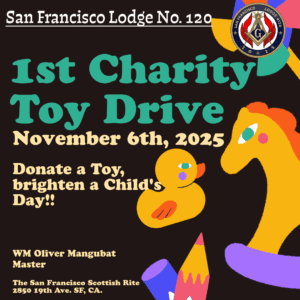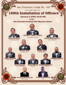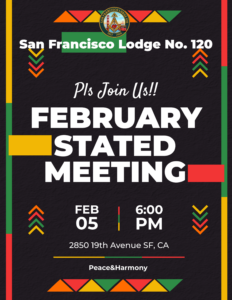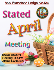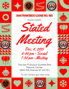 Our Stated meeting is every first Thursday of the month at the San Francisco Scottish Rite Masonic Center, 2850 19th Avenue, San Francisco, CA 94132. Social starts at 6:00pm and followed by our meeting at 7:30pm.